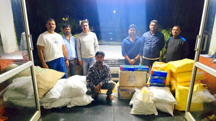 कोल्हापूर: कोल्हापूरातील भोई गल्ली बिंदू चौक येथे राहणारा जावेद बागवान हा इनोव्हा गाडी क्र एम एच 12 एच टी 2421 मधुन अवैद्य गुटखा घेवून येणार असल्याची माहिती सहा. पोलीस निरीक्षक सागर वाघ यांच्या पथकास मिळाली. या माहितीचे अनुषंगाने दि. 05 ऑक्टोबर रोजी रात्रीच्या वेळी पोलिस पथकाने भोई गल्ली बिंदु चौक कोल्हापूर येथे सापळा लावून अवैधरित्या गुटखा वाहतुक करणाऱ्या जावेद मलीक बागवान, वय 38 यास त्याच्या टोयोटा कंपनीच्या इनोव्हा गाडी क्र एम एच 12-एच टी 2421 सह पकडले. त्याच्याकडून आर. एन सेंटेड सुपारी, आर एन सेंटेड तंबाखू, एम4 रॉयल जाफराणी जर्दा, आर.एम.डी. पान मसाला, मुसाफिर पान मसाला, एम सेंटेड टोबॅको गोल्ड, V-1 टोबॅको, रजनीगंधा फ्लेवर्ड पान मसाला, विमल केशरयुक्त पान मसाला तसेच इतर साहित्य असा एकूण 10 लाख 74 हजार 260 रुपये किंमतीचा मुद्देमाल जप्त करण्यात आला .